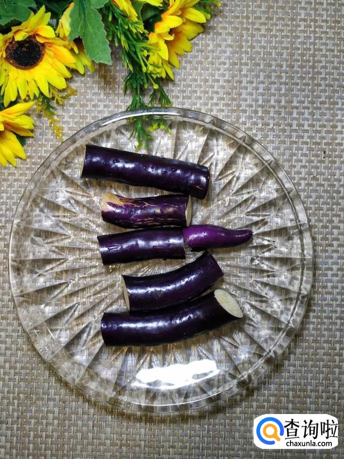 准备一个紫茄子,切成大段,煎好茄子再切不容易吸油。