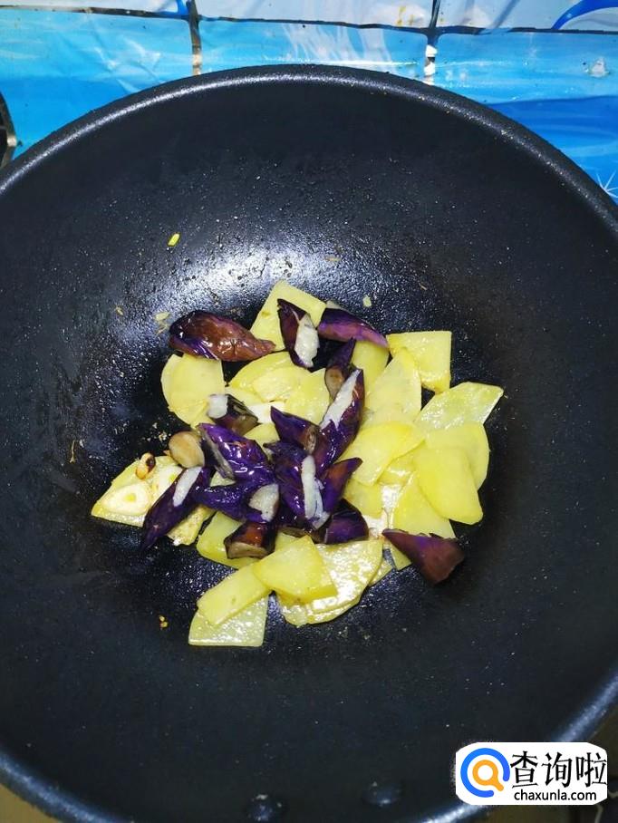 炒至土豆片微微变色之后,将准备好的茄子倒入锅中,翻炒均匀。