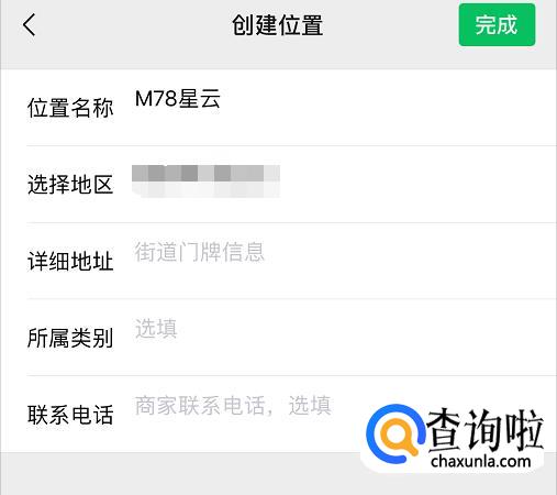 除了【位置名称】和【地区】必填,其他都是选填,将位置信息填写完毕后,点击完成即可创建,如下图所示;