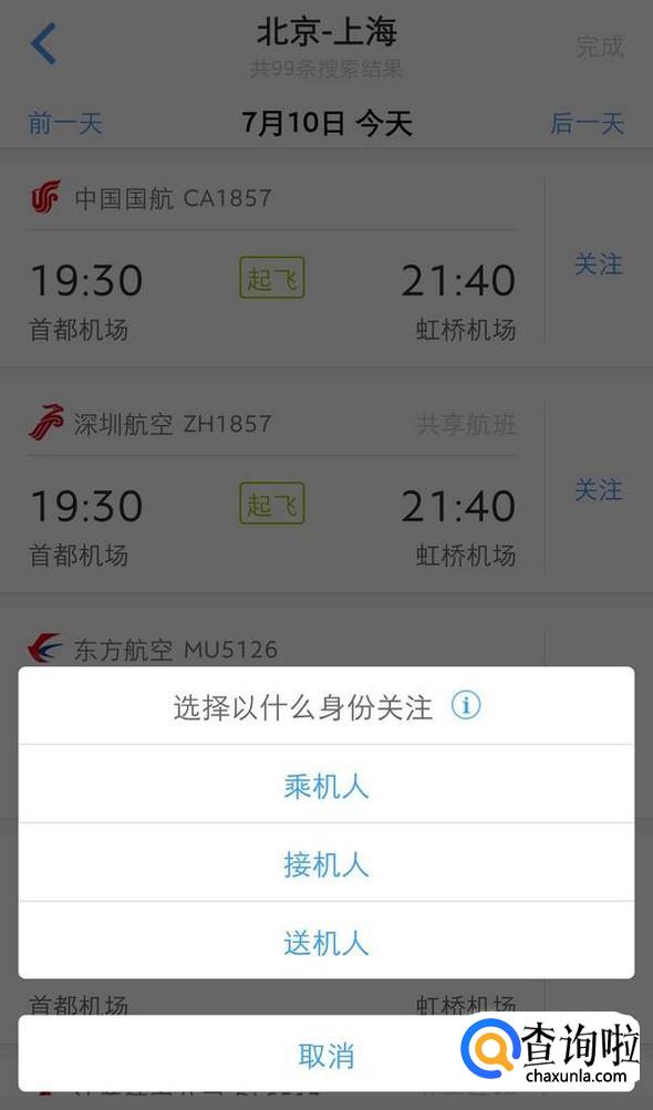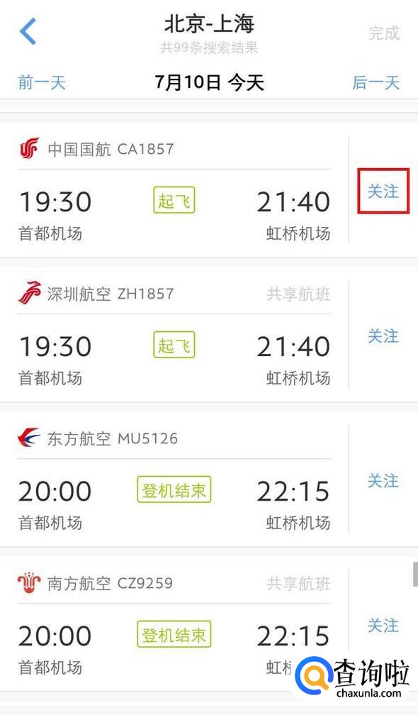 按起降地搜索的结果会比较多,找到自己需要的航班,点击后面的“关注”;