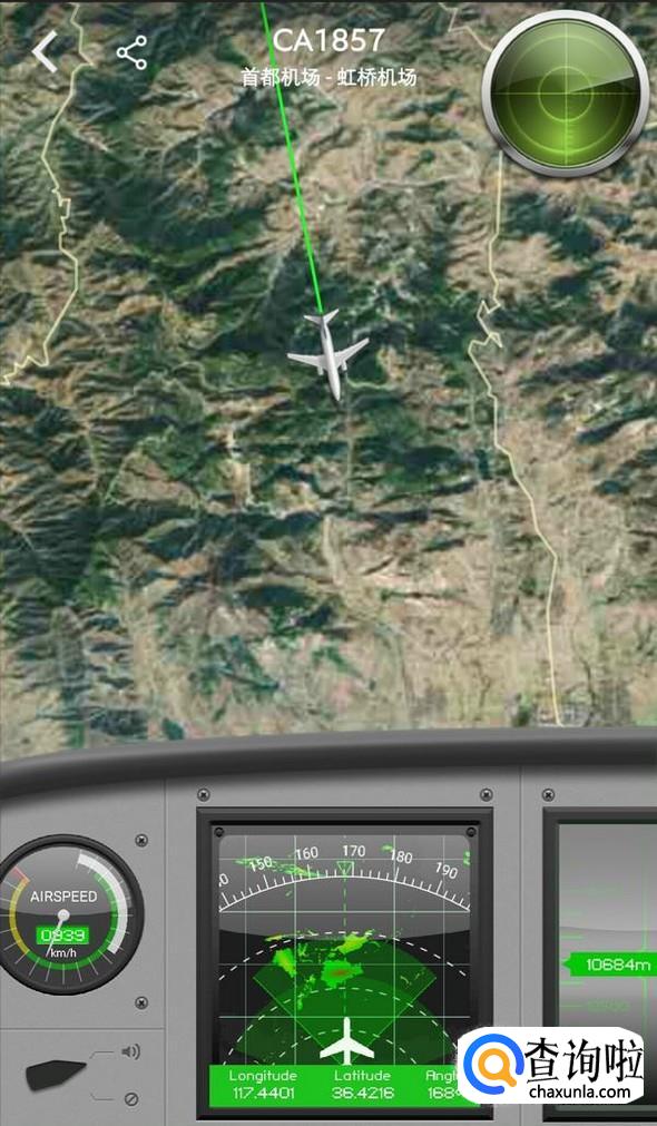 点击航班信息最上方的绿条,会跳转到地图界面,显示飞机飞行轨迹、高度和速度等信息;