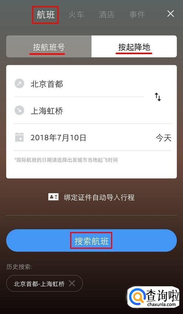 默认是添加航班的行程,可以按航班号或起降地搜索航班,当然航班号是最直接准确的;