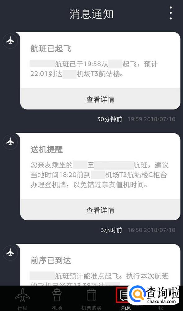 在消息页面里会有航班关键的时间信息提醒,很贴心,软件还有一个隐藏的操作,在添加好行程的同时,它会自动添加一条日程到你的手机里;