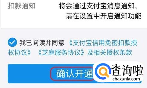 我们以支付宝为例,点击右侧的“去开通”以后,系统就会跳转到支付宝APP对应的开通界面,我们只需点击下方的“确认开通”即可,不过需要具备芝麻分350分以上才能开通哦;