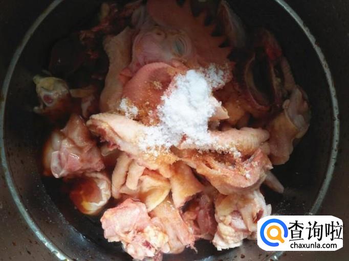 一大勺料酒,一勺食盐,一小勺老抽,一大勺生抽,一大勺白糖,全部倒进鸡块里面,然后搅拌均匀腌制半小时。