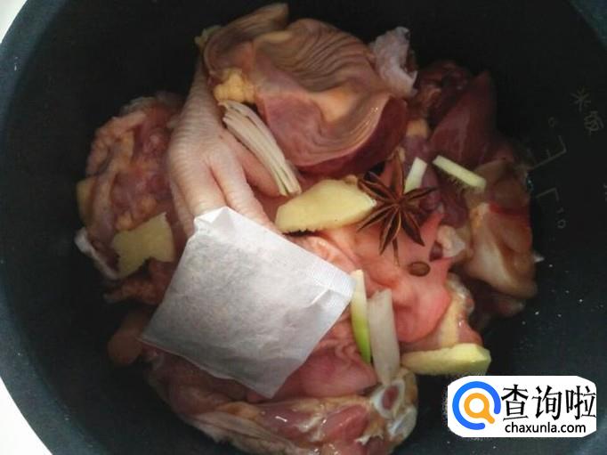大概十五分钟后,将刚刚放进去的炖鸡料包和那个八角拿出来不要了,不然炖出来的鸡汤调料味道过于重,盖上盖子继续炖大概二十分钟。