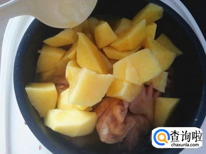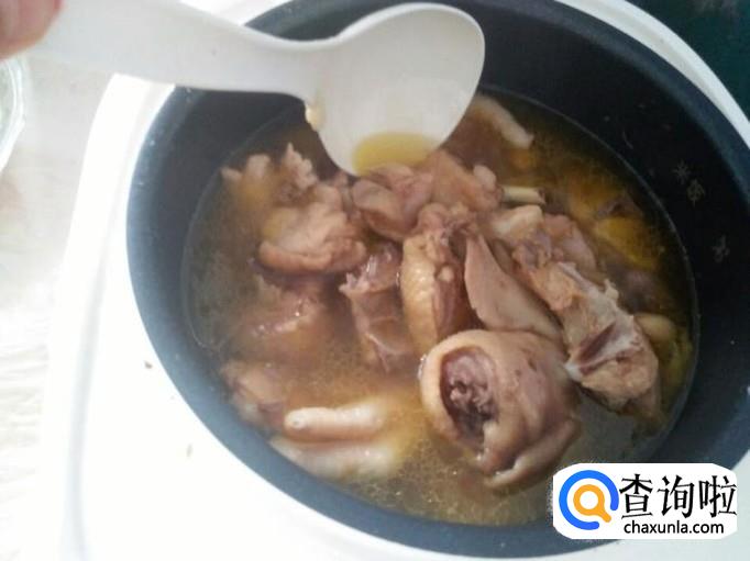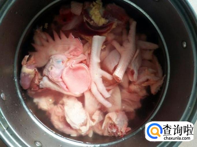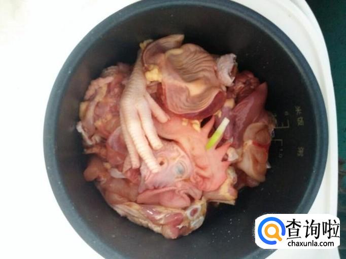 将清水倒入电饭煲里,清水没过鸡块。你要是喜欢喝汤,那就多倒一些清水。