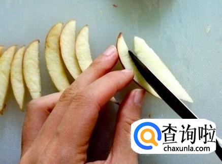 再切下一片厚厚的苹果,然后竖着将苹果切成十片,其中八片苹果只留下靠近边缘的一小部分,当作螃蟹爪,一共切八个螃蟹爪。
