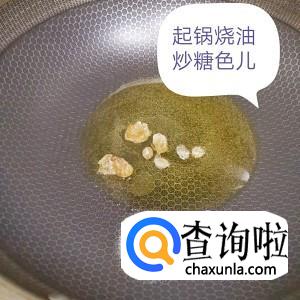 起锅小火放冰糖炒糖色,我家不爱吃太甜就放了一点点,小火慢慢炒别急,炒到红棕色