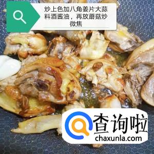 放入控水后的鸡,炒上色加入大蒜姜片八角炒一下,然后加入蘑菇炒微焦有香味儿