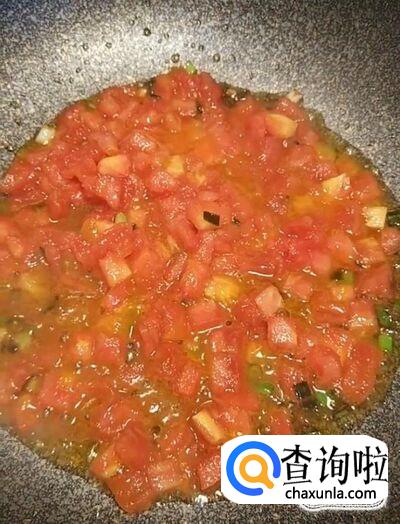 接着我们起锅烧油,油热下入葱花,爆香一下,放入切好的西红柿丁,翻炒一下