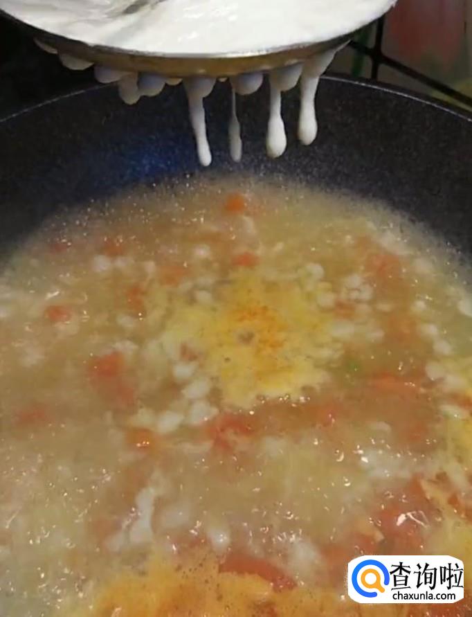 接着,我们倒入适量的清水,把调好的面糊倒入漏勺,漏出小疙瘩,漏入锅中,煮开
