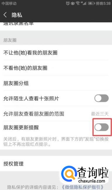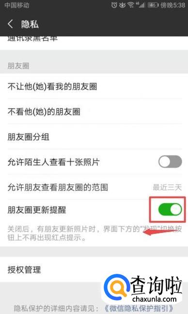 弹出的界面,我们将朋友圈更新提醒的开关向左滑动;