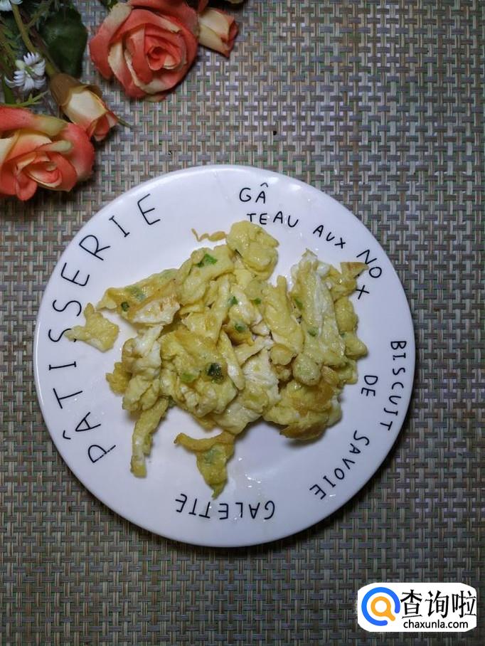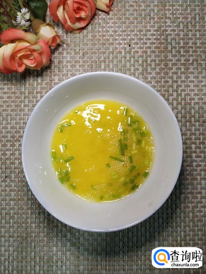 准备适量小葱,洗净后切碎,碗中打入一个鸡蛋,将小葱碎放入碗中,和鸡蛋一起打散。炒锅中放入适量油,油热后将鸡蛋放入锅中炒熟,盛出备用。