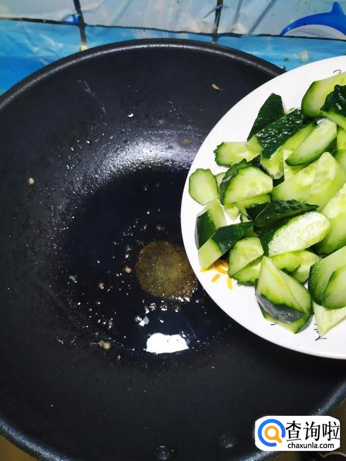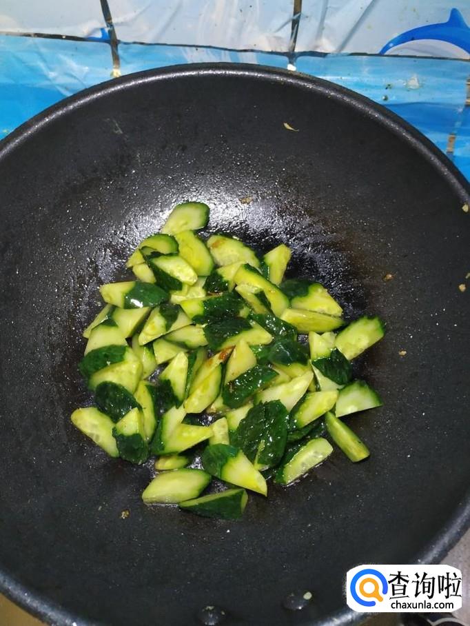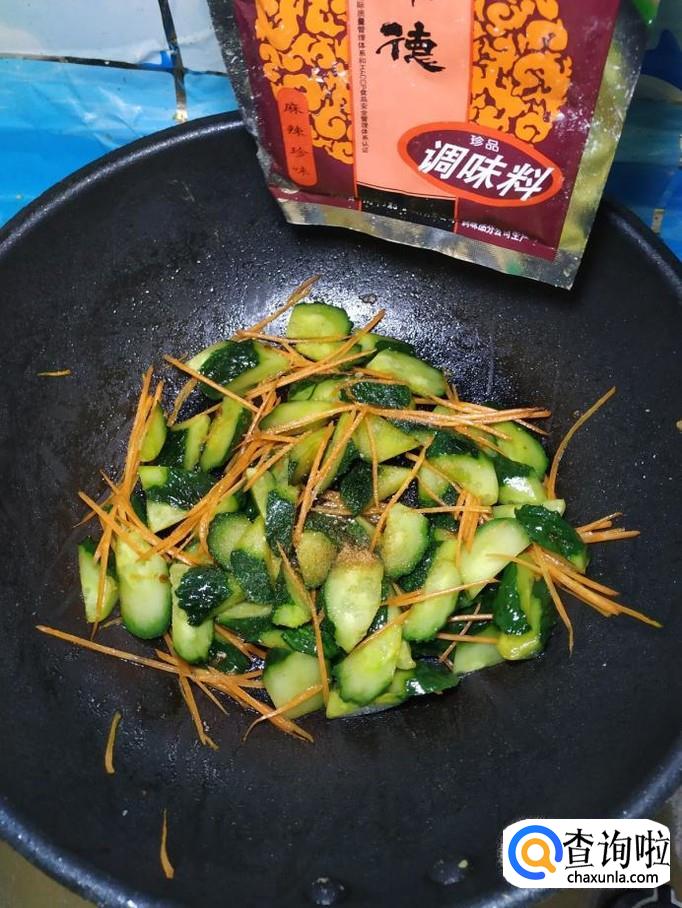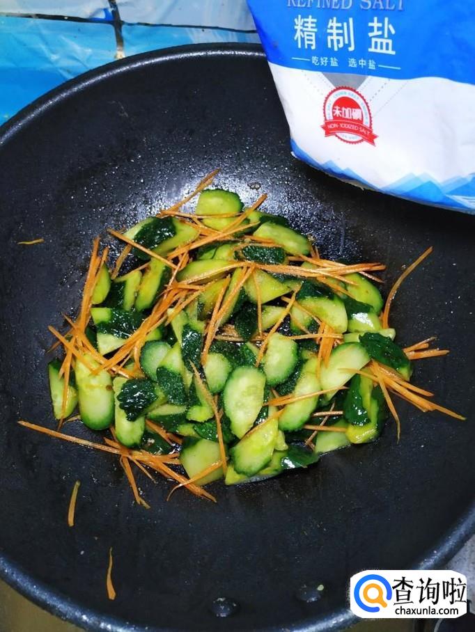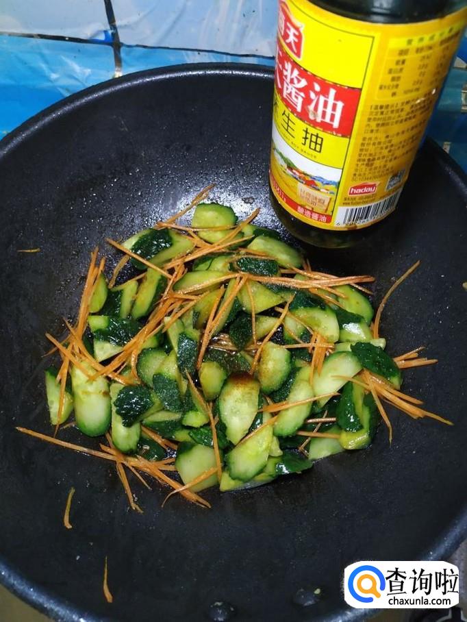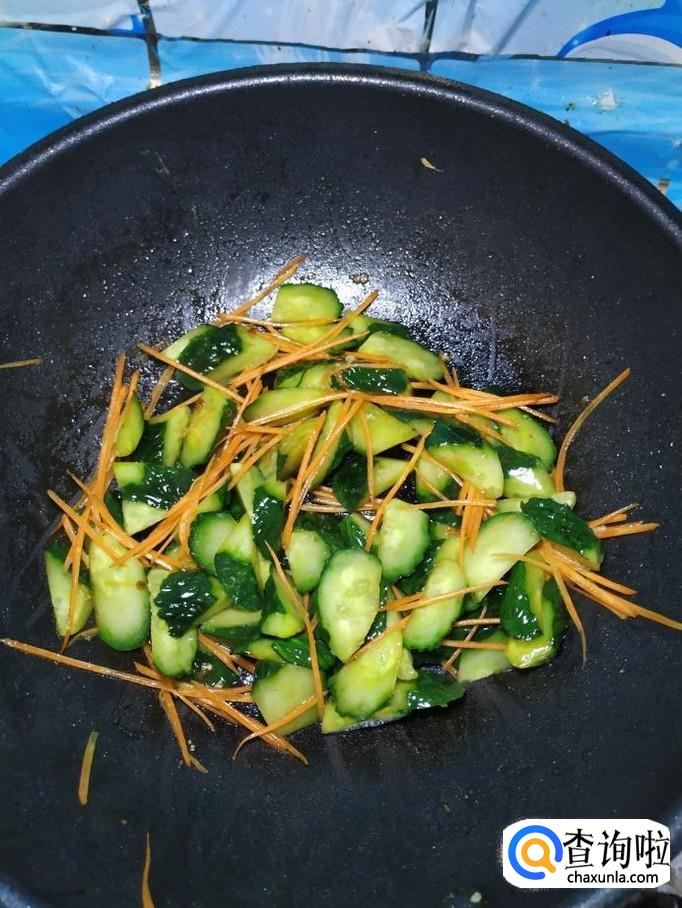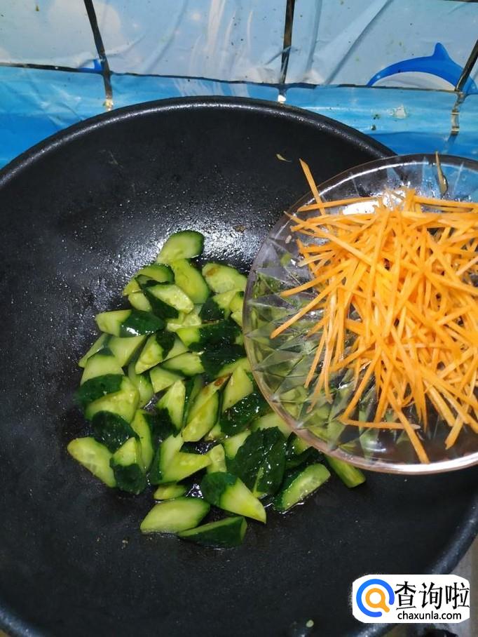 将胡萝卜丝倒入锅中,和黄瓜一起翻炒均匀。