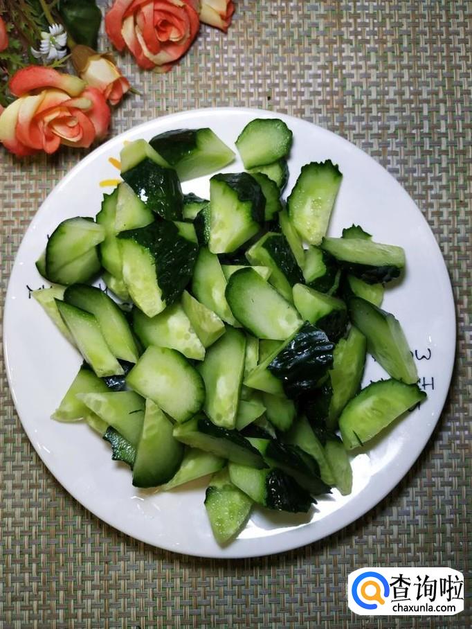 准备一根黄瓜,用清水洗净后,切成滚刀块儿,放入盘中备用。注意,黄瓜皮不用去掉,黄瓜皮中也含有丰富的维生素,清洗的时候可以在水中加少许食盐,这样可以去掉农药残留。