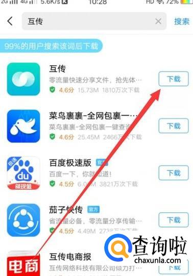 进入手机的应用商店,搜索“互传”,点击下载安装即可,如图所示。
