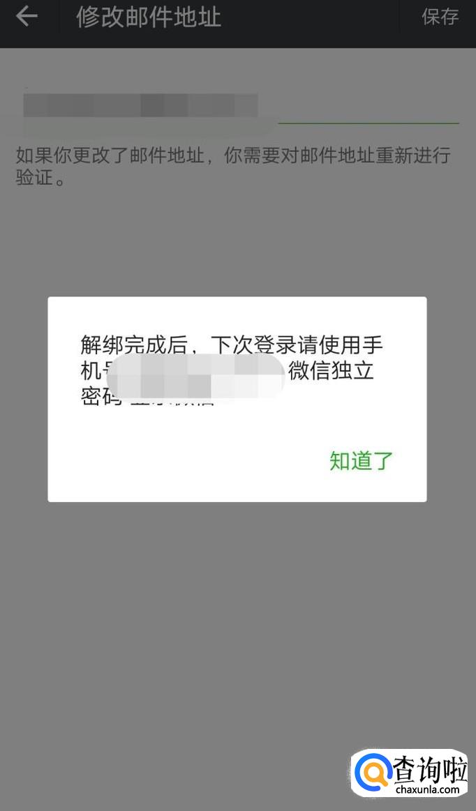 看到弹出的提示,点击知道了,然后退出此界面,再次打开,此时可以看到邮件地址显示“未绑定”了。