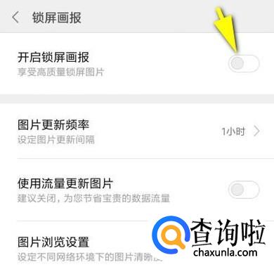 进入到设置锁屏画报的界面,在“开启锁屏画报”右侧这里,有一个开关按钮。当前是蓝色状态,手指点一下右侧,呈灰色状态,那么,锁屏画报就关闭啦。