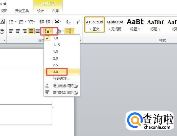 然后我们点击工具栏中的那个按钮,弹出的界面,我们可以看到行距,此处我们直接选择3.0;