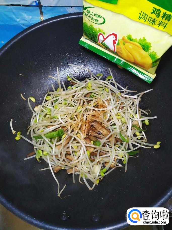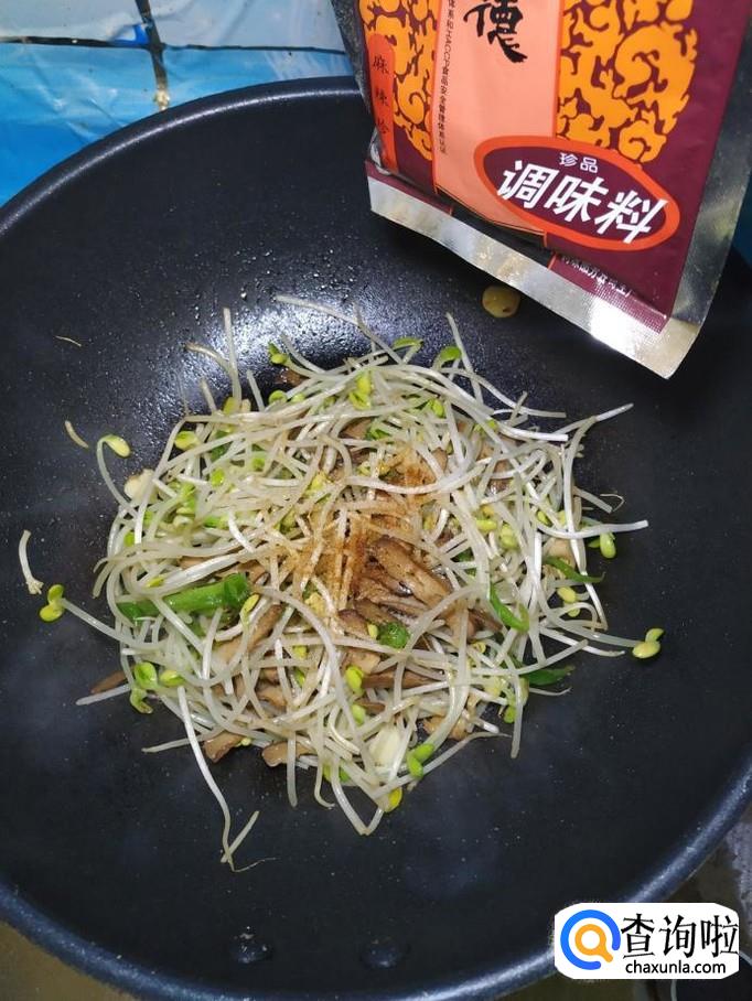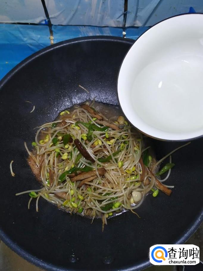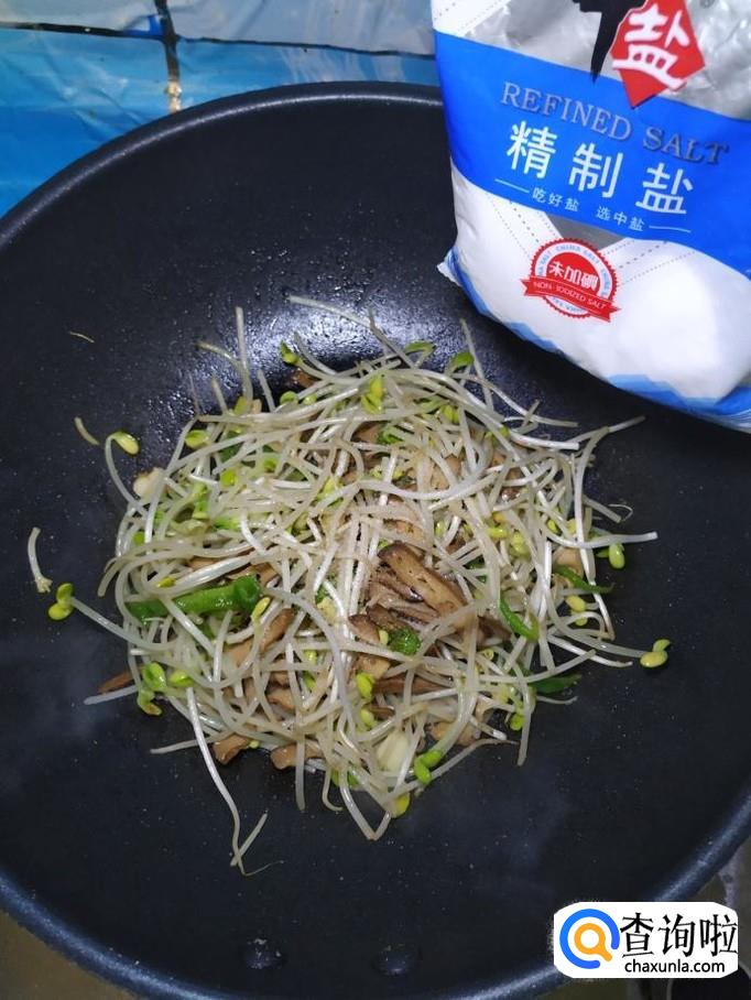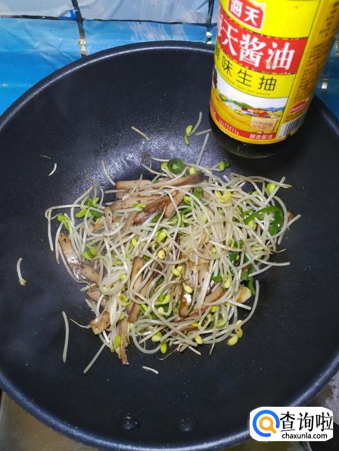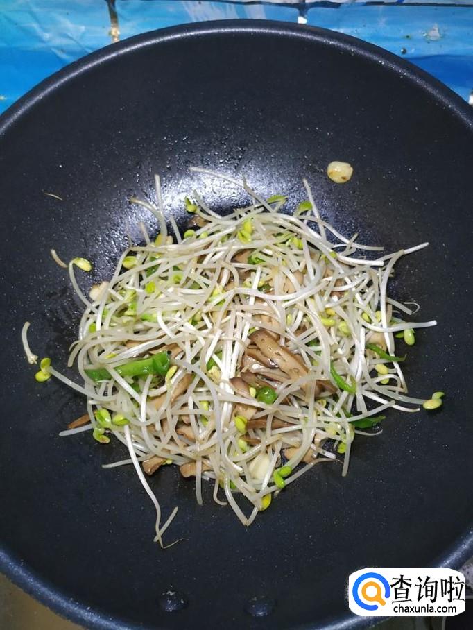 将黄豆芽倒入锅中,翻炒均匀,比起绿豆芽,黄豆芽比较难熟,所以要多炒一会儿。
