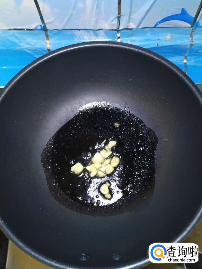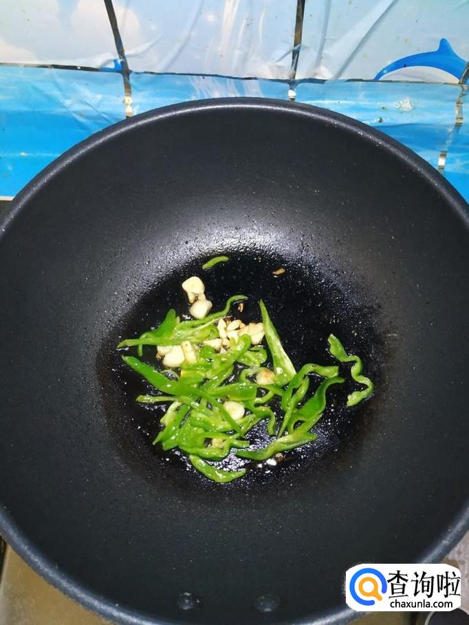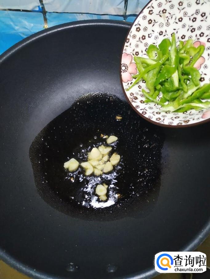 准备适量蒜,洗净后切片,炒锅中放入适量油,油热后,将青椒丝倒入锅中炒香。