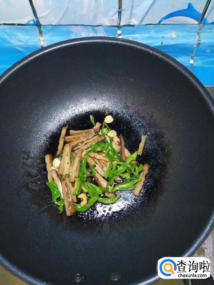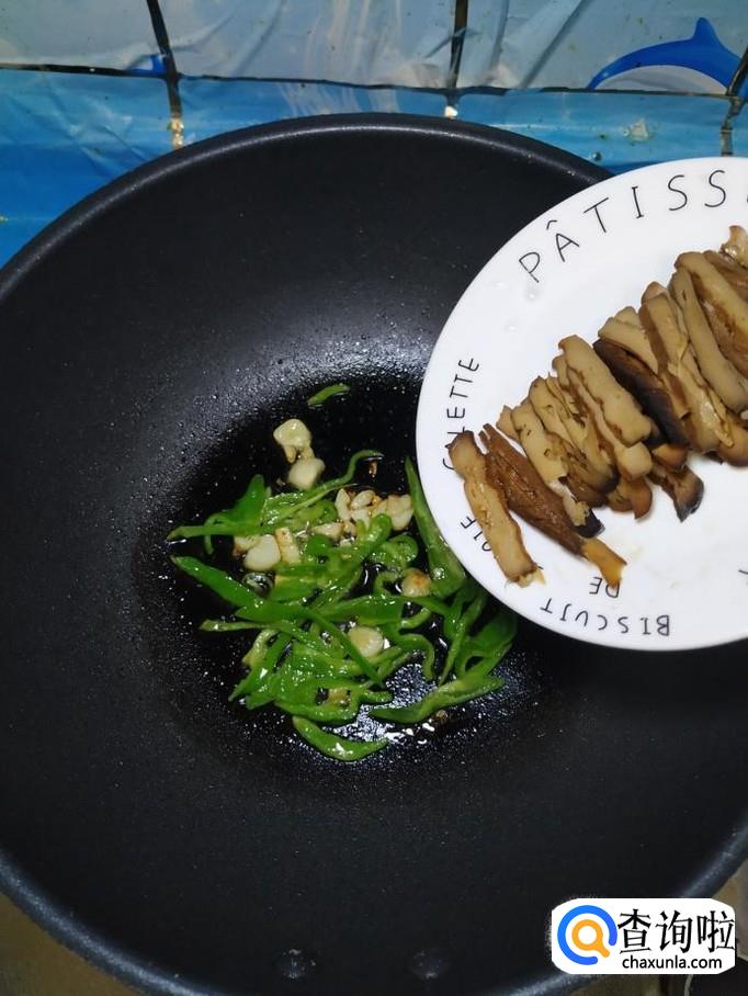 将准备好的豆干条也倒入锅中,与青椒一起翻炒均匀。