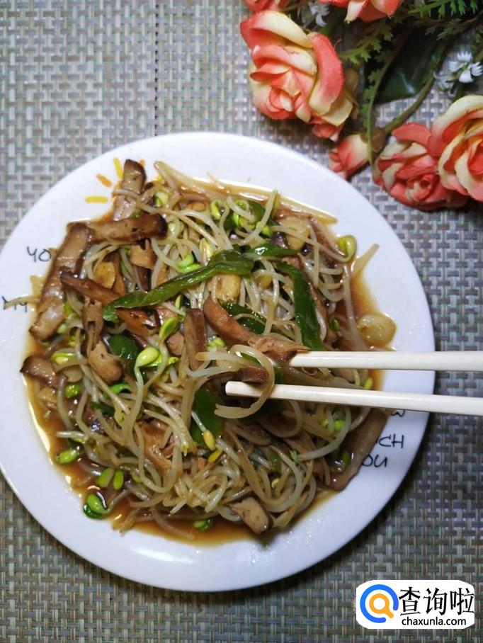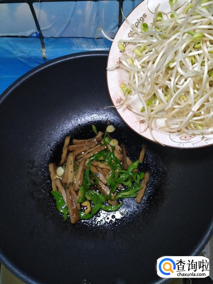 黄豆芽适量,青椒适量,豆干适量,盐适量,鸡精适量,五香粉适量,生抽适量,陈醋适量。