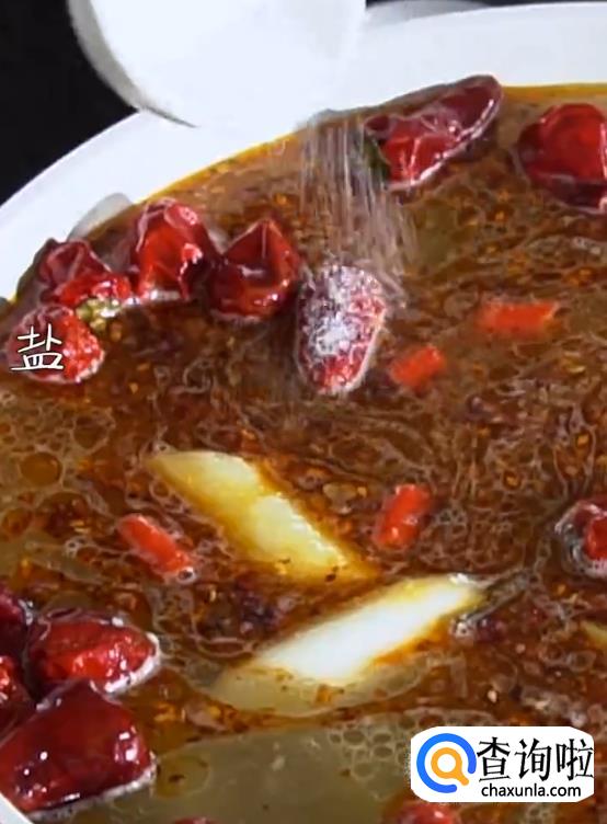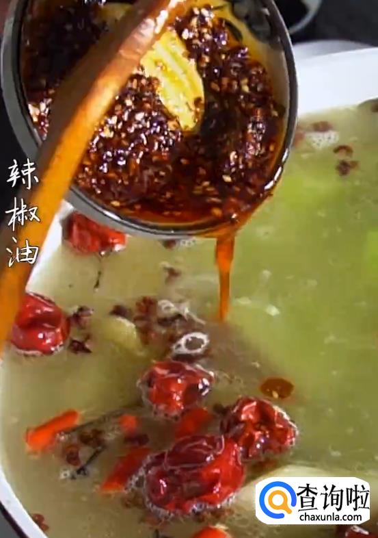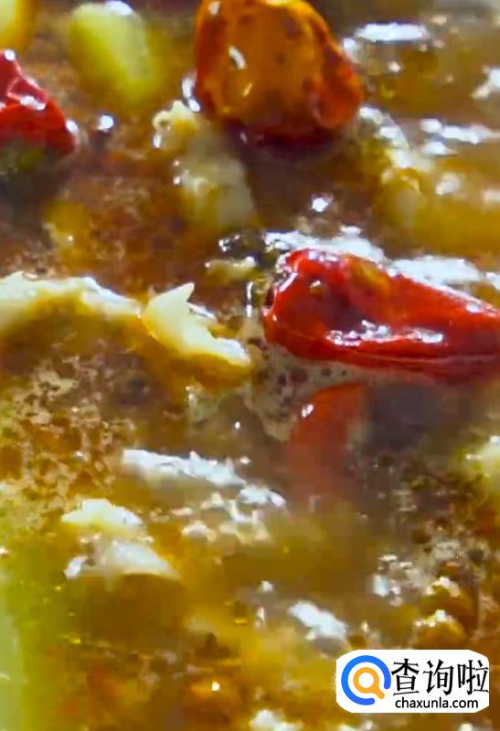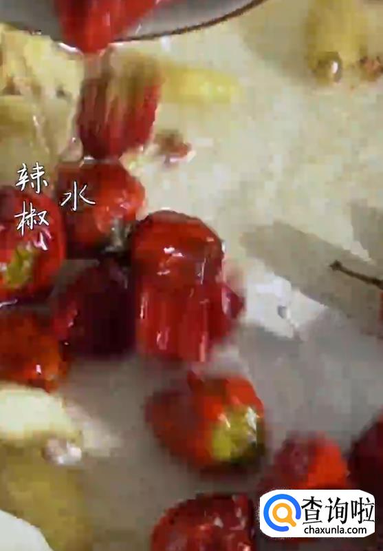 热锅起油,下姜蒜片爆香,倒入胡椒,泡椒,辣椒和水翻炒。