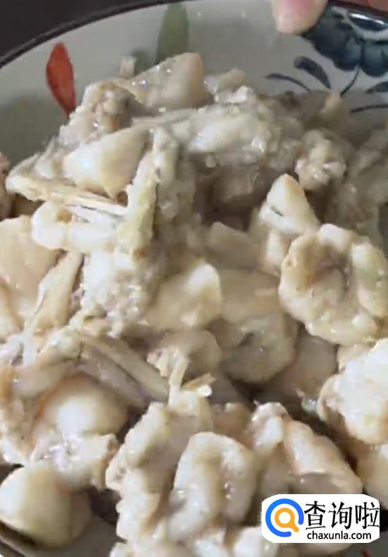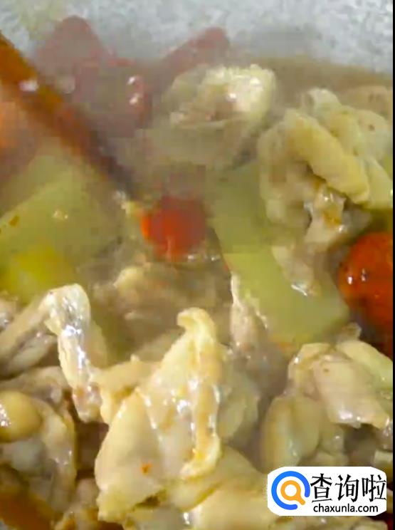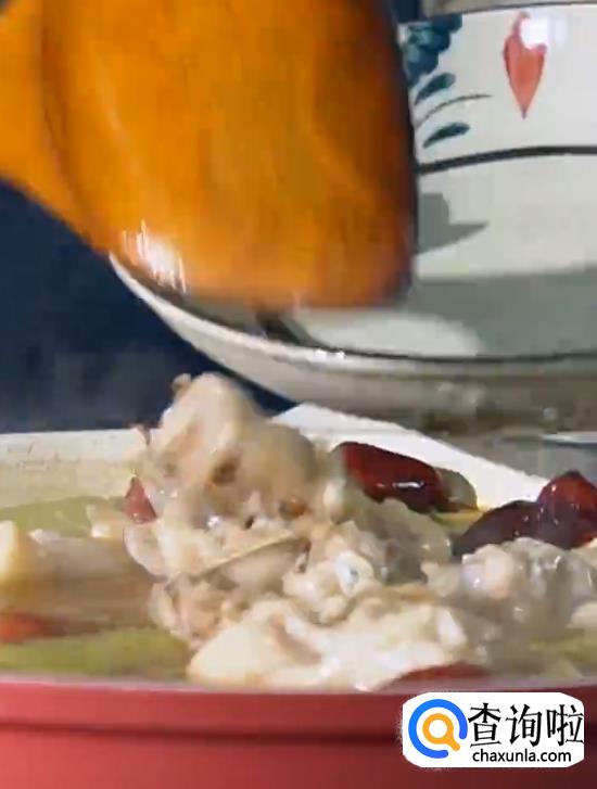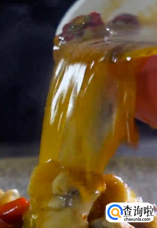 将煮好的牛蛙肉捞出,然后淋上汤汁。