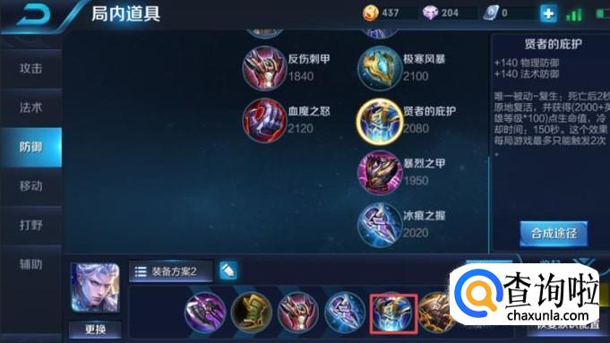 第五件装备我们可以出贤者的庇护了,这个装备其实也就是复活甲,当死去之后可以立马复活一次,此时的铠是非常需要这个装备的,因为铠本身是战士,血量还是非常高的,当死去后,立马复活也不会立马死去的,可以进行第二次攻击。