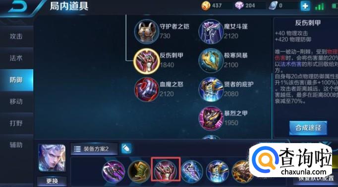 第三件装备,我们可以出反身刺甲,这个装备的优势并不是被动效果,而是加420的防御力,这个防御力加上去之后,基本上射手就很难杀死我们了,此时的铠基本一套技能下去,对面的射手也就死了。