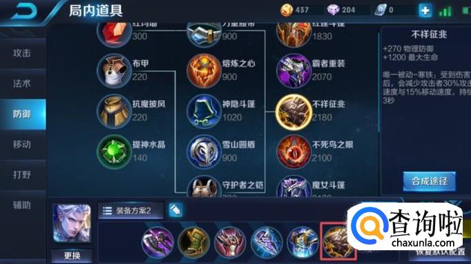 最后一件装备我们可以出不祥征兆,这个装备可以加1200点血量,其次还能增加270的物理防御,此时出这件装备是为了不让对方的高额输出射手直接秒杀我们的铠,意义很大。