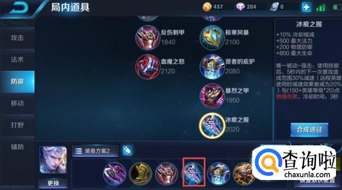 第四件装备我们可以出冰痕之握,这个装备的属性是非常多的,非常适合铠,可以加血量,可以技能缩减,还可以加法力和物理防御,这个装备出了之后,基本上我们的铠就可以秒杀很多脆皮了。