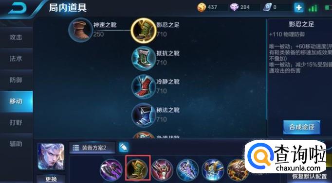 第二件装备我们可以出影忍之足,这件装备可以加110的防御能力,是非常适合铠的,一般铠上单的话,会遇到对方的射手加辅助,那样的攻击力,是需要足够的防御力才能抵抗得了的。