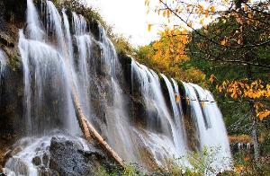 树正瀑布 从沟口经魔鬼岩过树正群海,再向上二、三里路,游人便闻水声轰轰,震耳欲聋,雾气阵阵,扑面而来。定神一看,一条阔50来米,高20余米的瀑布,正从古树丛中奔腾而处,瀑面之上,又有不少树木阻挡分流,这个出没于悬崖树林之中的瀑布,便是树正瀑布。 这种奇特的瀑布景观,的确足以令游历甚广的人惊叹不已。那翻着雪浪的瀑布,与苍劲古老的树木一动一静,形成了强烈的对比,然而又组合成一幅和谐的天然图画。有人这样形容树正瀑布的奇丽神妙之景色:只见枝叶葱绿的古木那弯曲着的躯干半浸在瀑布中,任凭白花花的瀑布冲刷着,宛若一个个头披秀发,裸露玉体的仙女,在圣水中尽情地沐浴嬉戏。大自然的神奇景色,有时竟能使人若身置伊甸乐园之中! 尽管许多树木是深深扎根于崖间岩缝之中,有的甚至一条支根被瀑布冲刷出来后,又拼命地扎入另一处岩缝之中,顶着浪花翻滚的瀑布,顽强地拚搏着;但亦有些树木,经不住瀑布的冲刷,而被冲出带走。 天工造化,鬼斧神匠,树正瀑布,可谓奇瀑了。瀑布之上,不仅水石相激,浪花飞溅,更有水木相搏,堆雪碎冰。九寨沟瀑布群景观之美,由此可窥一斑。
