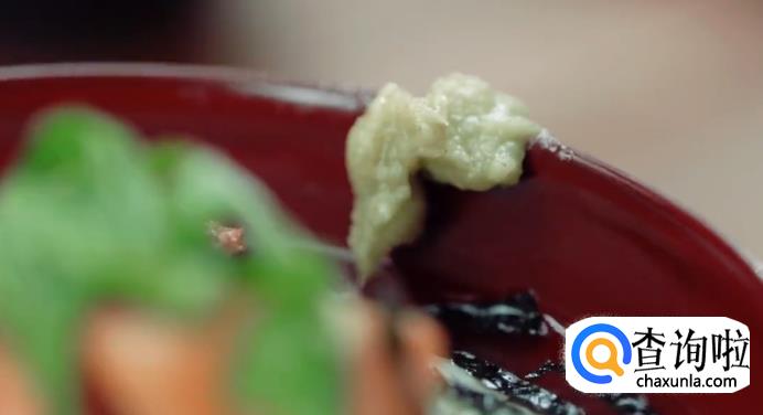 在放凉的米饭上摆盘,将梅子,三文鱼,紫苏叶摆盘,然后凭喜好添加芥末泥。