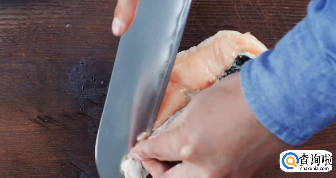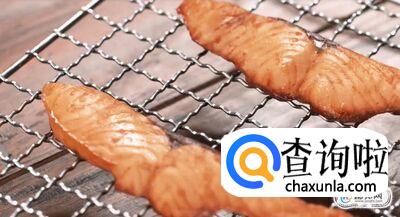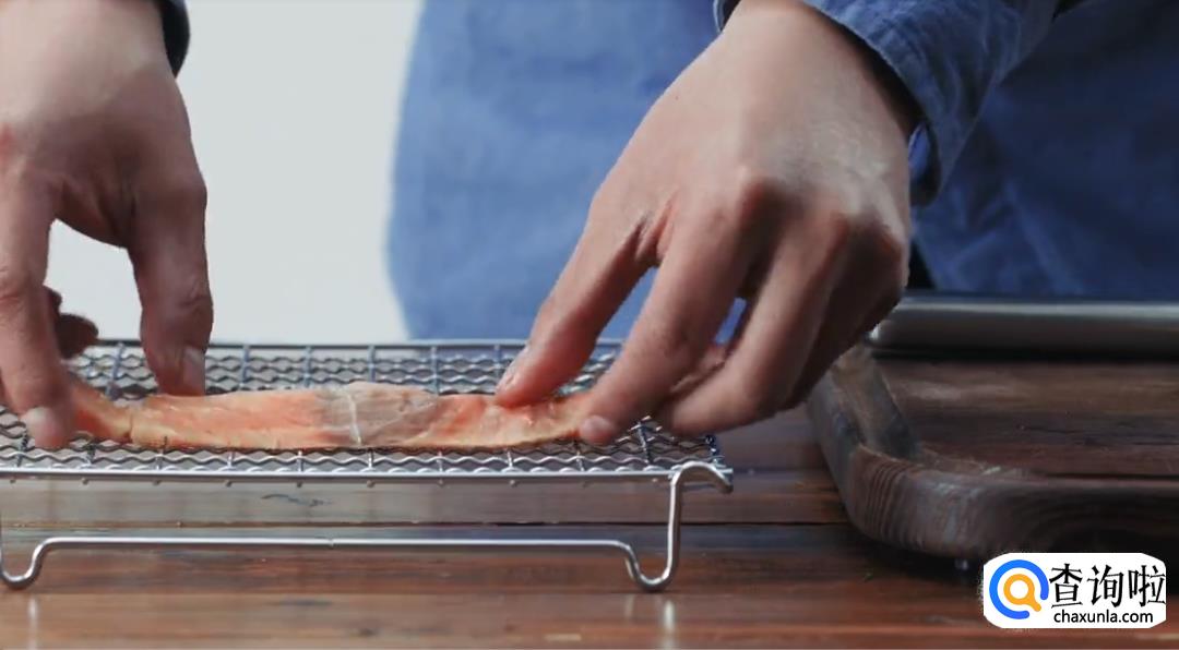 将盐烧三文鱼去皮,然后铺平在烤架上。