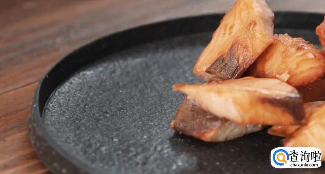 烤箱预热200度,然后将三文鱼放图进行烘烤,直至变色,表面变干,然后取出切块备用。