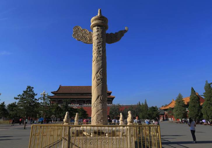 相传舜立木牌于交通要道,供人书写谏言,针砭时弊。远古的华表皆为木制,东汉时期开始使用石柱作华表,华表的作用已经消失了,成为竖立在宫殿、桥梁、陵墓等前的大柱。华表通常由汉白玉雕成,华表的底座通常呈方形,是莲花座或须弥座,上面雕刻有龙的图案,蟠龙柱上雕刻一只蟠龙盘于柱上,并饰有流云纹;上端横插一云板,称为诽谤木;石柱顶上有一承露盘,呈圆形,因此对应天圆地方,上面的蹲兽为传说中的神兽朝天吼,或称为望天犼。