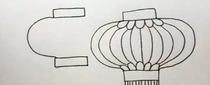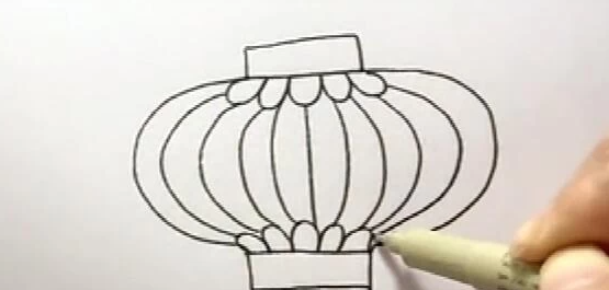 2、再用波浪换出灯笼上下两边的花纹。用弧线画出灯笼中间部分的支架。