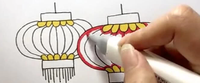 4、再两个灯笼上方画上直线,表示灯笼上的线。最后给灯笼涂上