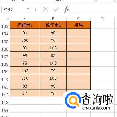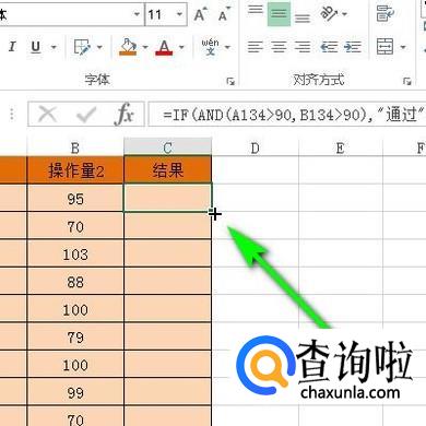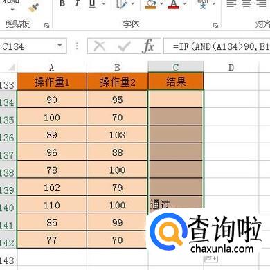 下面举例演示用法。比如,下图表格数据,当操作量1与操作2都大于90时,结果显示为通过。