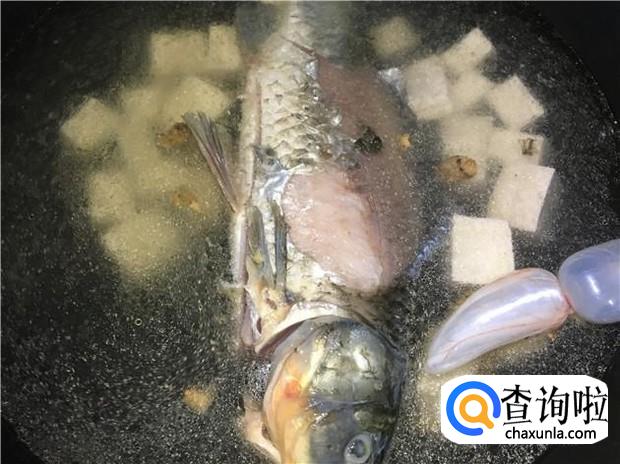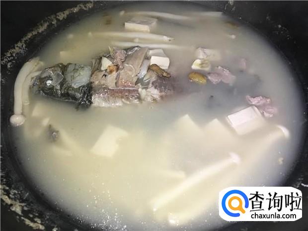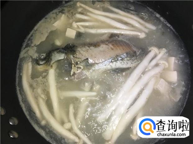 大火把鲫鱼和豆腐煮熟,大概煮10分钟,再把海鲜菇倒入锅中,煮5分钟即可,加入少许盐调味,就可以出锅,享受美味清甜的鲫鱼汤了。