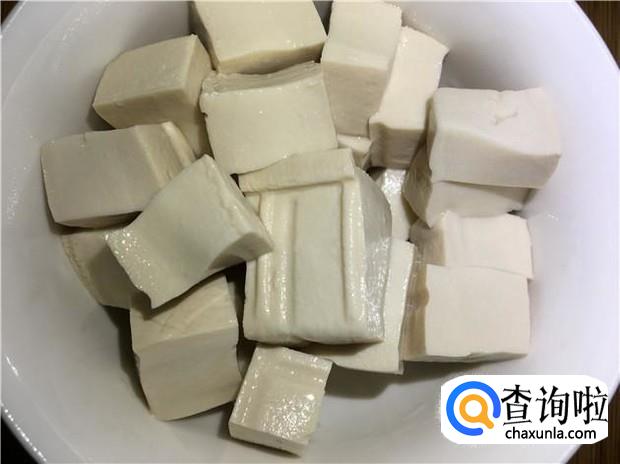 嫩豆腐用盐水泡一下,去掉豆腥味,然后切成小块。