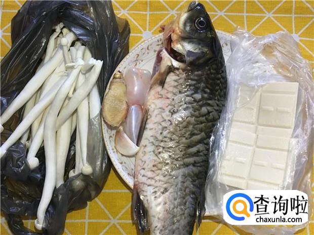 把做鲫鱼汤的食材准备好:新鲜的鲫鱼一条、嫩豆腐适量、海鲜菇适量、老姜一块。
