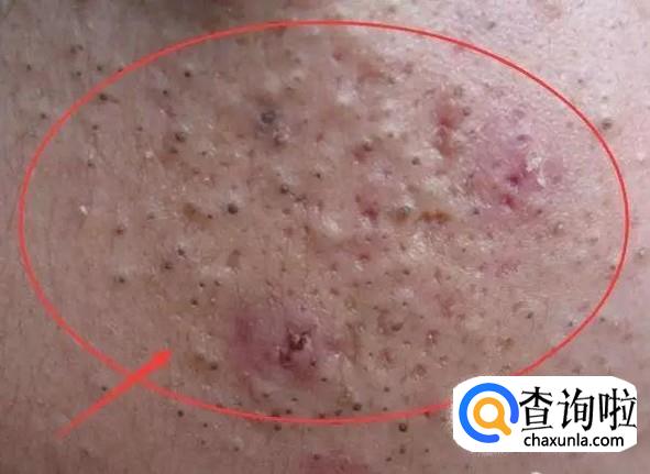 眼观:黑头的后续阶段,毛孔已经出现发红、肿起等炎症,严重的话毛孔里还有白色分泌物。