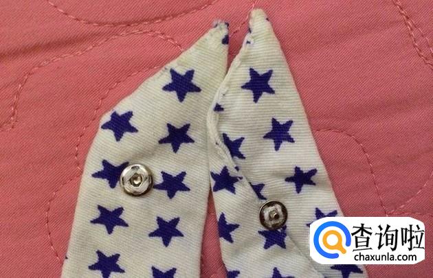 缝好了之后在三角的两个角的地方弄一个按扣,也可以缝上一个小纽扣,这样方便这宝宝围上三角巾,并且不会滑脱。