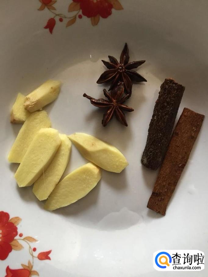 取一块姜,将姜去皮洗净,切成片状;取两个八角、两个桂皮,洗净,备用;八角和桂皮其实下不下都行,下了会使可乐鸡翅的味道更好;