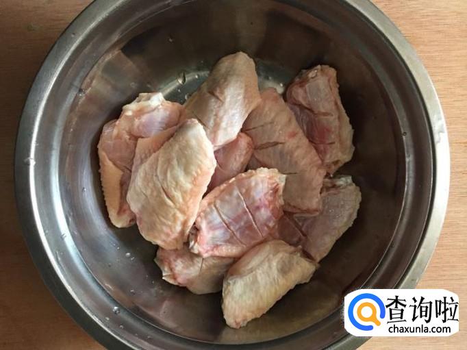取十个左右鸡翅,加水解冻;检查一下鸡翅表面,如果有毛,将毛拔掉;将鸡翅洗净,在鸡翅表面划几道痕;